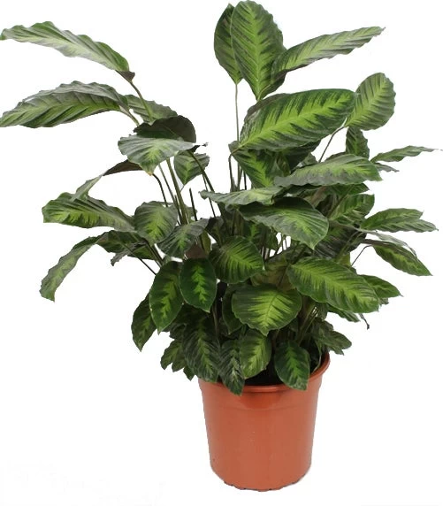 Bij ons is de Calathea in diverse vormen verkrijgbaar, hierbij is ook de nederlandse naam wisselend. Naast dat ze gewoon erg mooi staan in je interieur hebben Calathea’s ook nog eens een luchtzuiverende werking. Deze Calathea heeft donker groene bladeren met opvallende lichte veervormige strepen. Het is een niet allerdaags soort.