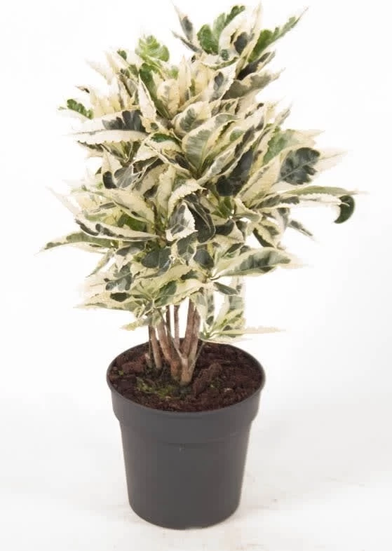 Deze aparte plant heeft van nature verschillende kleuren blad. In de meeste gevallen begint het blad als een normaal groen/ donkergroen blad waarna het uitgroeit en verkleurt naar verschillende kleur van geel, rood, oranje, paars, roze en alle kleuren hier tussen. Dit soort heeft witbont smal blad.