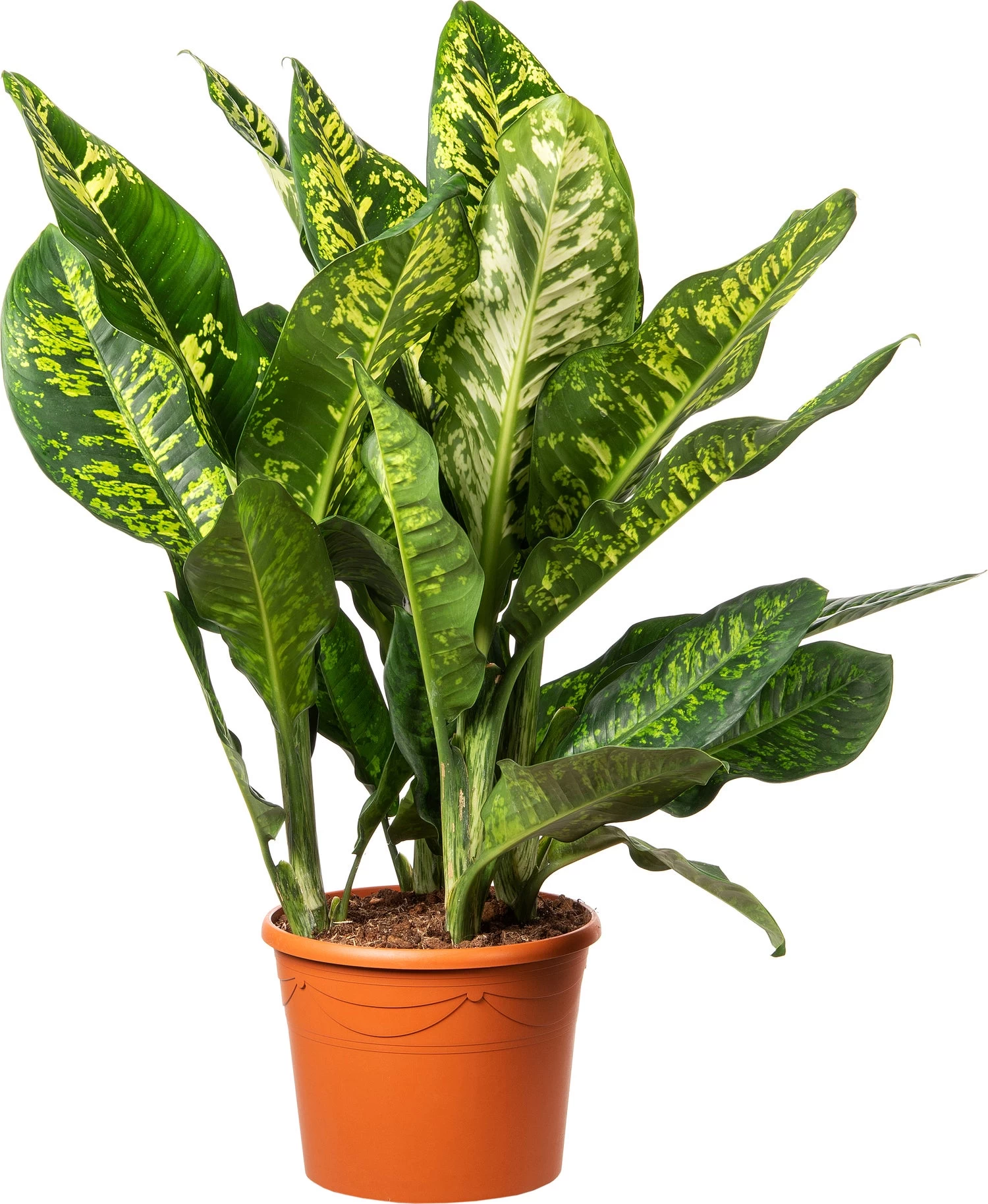Deze Dieffenbachia heeft grote roomwitte bladeren met een lichtgroene tekening en bladrand. In de lente en zomer vormen zich nieuwe bladeren in het hart van de plant, die eerst opgerold zitten en zich sierlijk ontvouwen. Zet de Dieffenbachia op een lichte plaats met indirectzonlicht. Deze tropische plant houdt van een hoge luchtvochtigheid en vochtige grond. Door de bladeren regelmatig te benevelen met ontkalkt water voorkom je bruine punten en spoel je het stof er zo af.