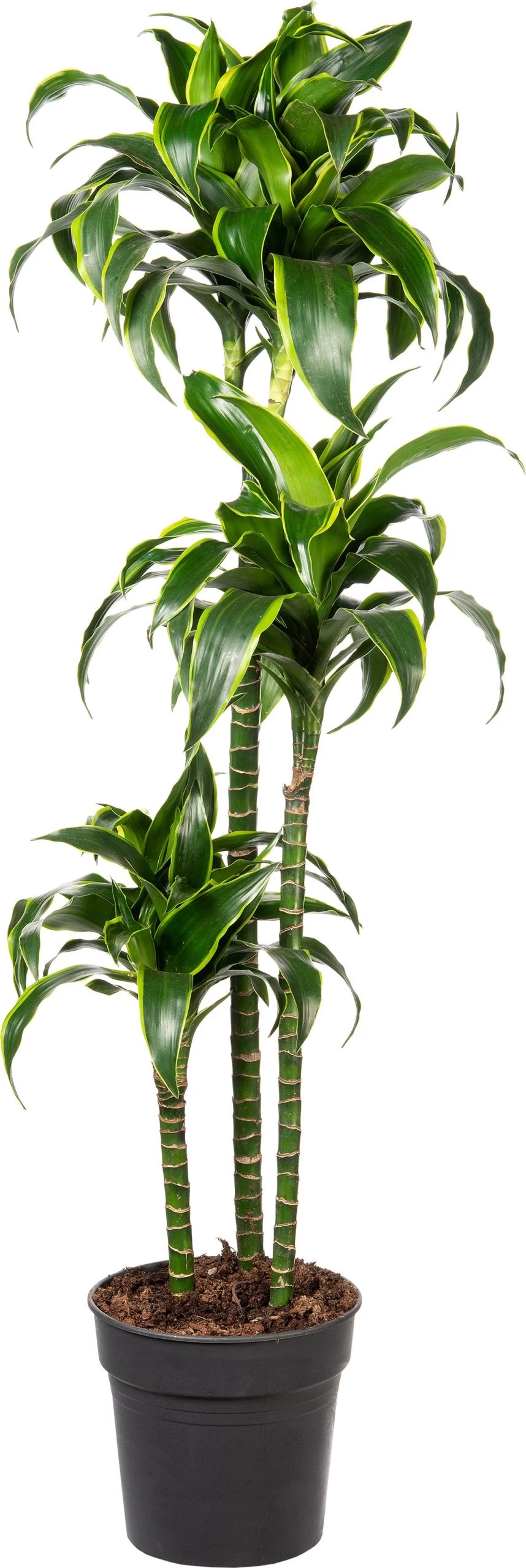 De Dracaena’s zijn populaire kamer- en kantoorplanten die makkelijk in het onderhoud zijn. Je kunt jarenlang plezier hebben van deze leuke bladplant, die ook nog een decoratieve stam heeft. De Dracaena fragrans heeft zijn naam’ fragrans’ vanwege zijn geurende bloemen, die echter zelden binnenshuis ontstaan. De Dracaena staat graag op een standplaats met indirect licht, maar verdraagt ook wat meer schaduw. De Draecena fragrans ‘Dorado’ heeft een lichtgroene rand aan het groene, langwerpige blad