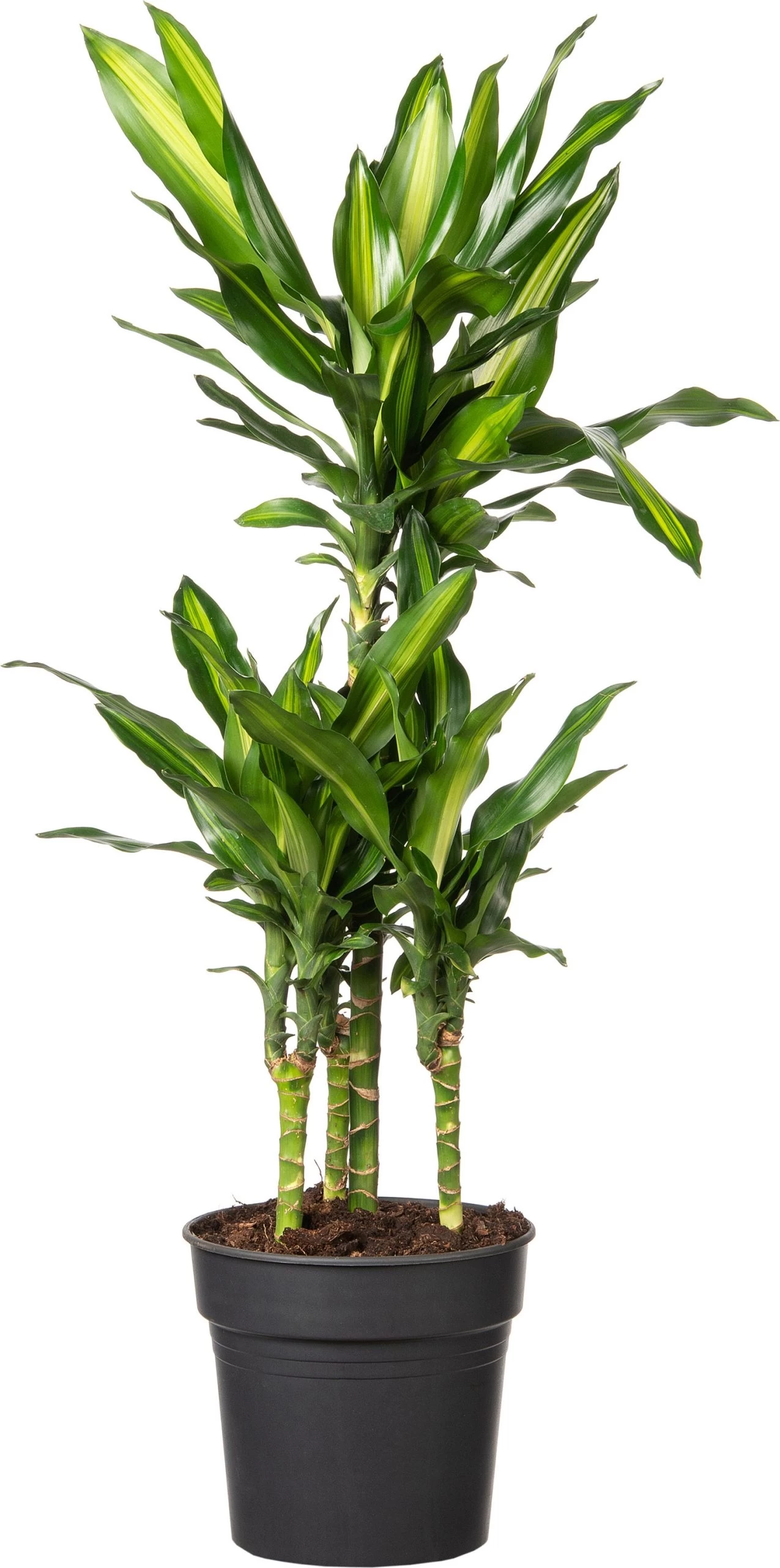De Dracaena’s zijn populaire kamer- en kantoorplanten die makkelijk in het onderhoud zijn. Je kunt jarenlang plezier hebben van deze leuke bladplant. De Dracaena fragrans heeft zijn naam’ fragrans’ vanwege zijn geurende bloemen, die echter zelden binnenshuis ontstaan. De Dracaena staat graag op een standplaats met indirect licht, maar verdraagt ook wat meer schaduw. De Draecena fragrans ‘Cintho’ heeft donkergroene, lange bladeren die een geelgroene streep hebben en op een stevige, rechte stam groeien.