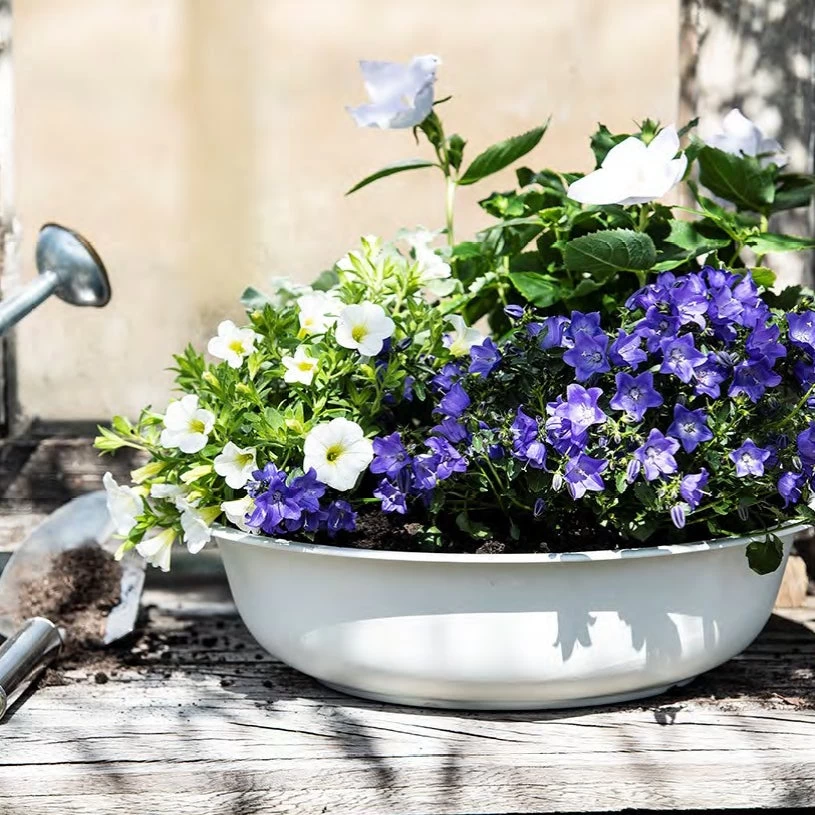 Een fraaiarrfangement met vrolijke voorjaars/zomerbloeiers! Zet de schaal in de zon en vergeet niet wat er te geven.