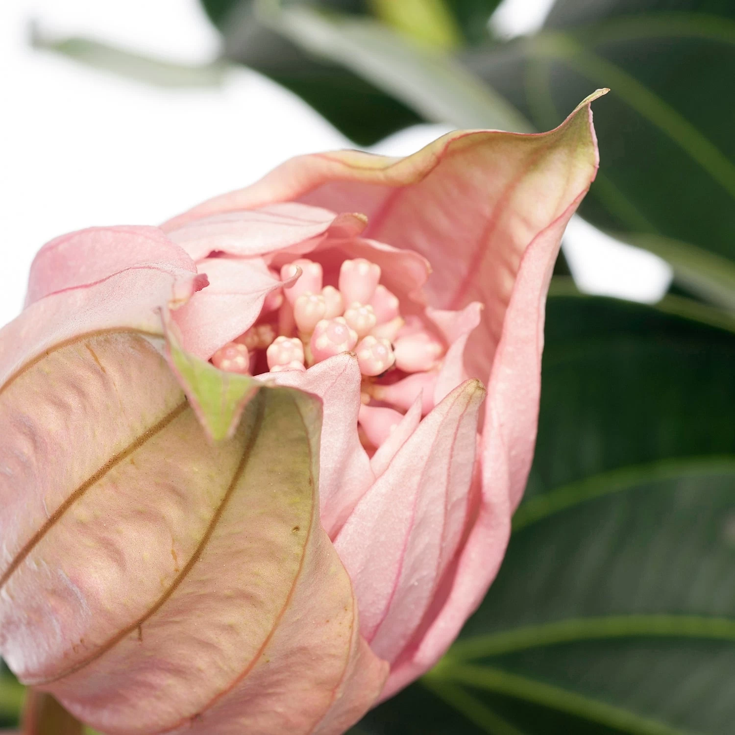 Het is een opvallende verschijning. De nerfstructuur is duidelijk zichtbaar en regelmatig, maar nog meer opvallend is de bloeiwijze. De bloemtrossen worden zichtbaar aan hangende stelen omrand met roze schutbladeren. Hij moet vaak even wennen aan zijn nieuwe omgeving. Houdt er rekening mee dat hij blad kan laten vallen of dat bladeren soms zelfs deels zwart kunnen worden. Geen nood, met de juiste zorg en wat geduld komt dit helemaal goed.