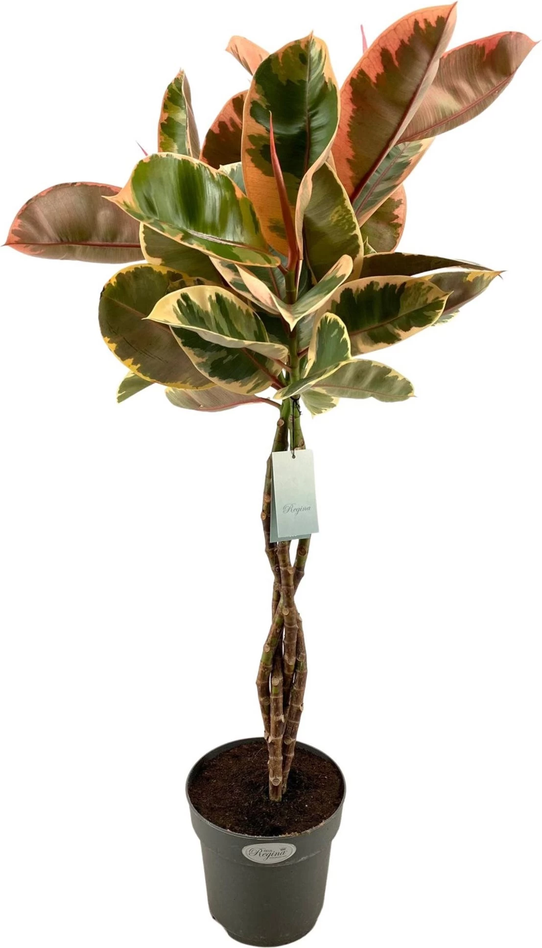 De elasica soorten binnen de grote familie van de Ficus hebben grote ovale bladeren in verschillende kleuren. In de natuur kan deze boom enorm worden, wel 30 tot 40 meter, en dat kan je ook merken in huis. De rustige groei gaat wel door en door! Het is een fijne plant met een luxe uitstraling. Dit specifieke soort heeft wit bont met roze blad.