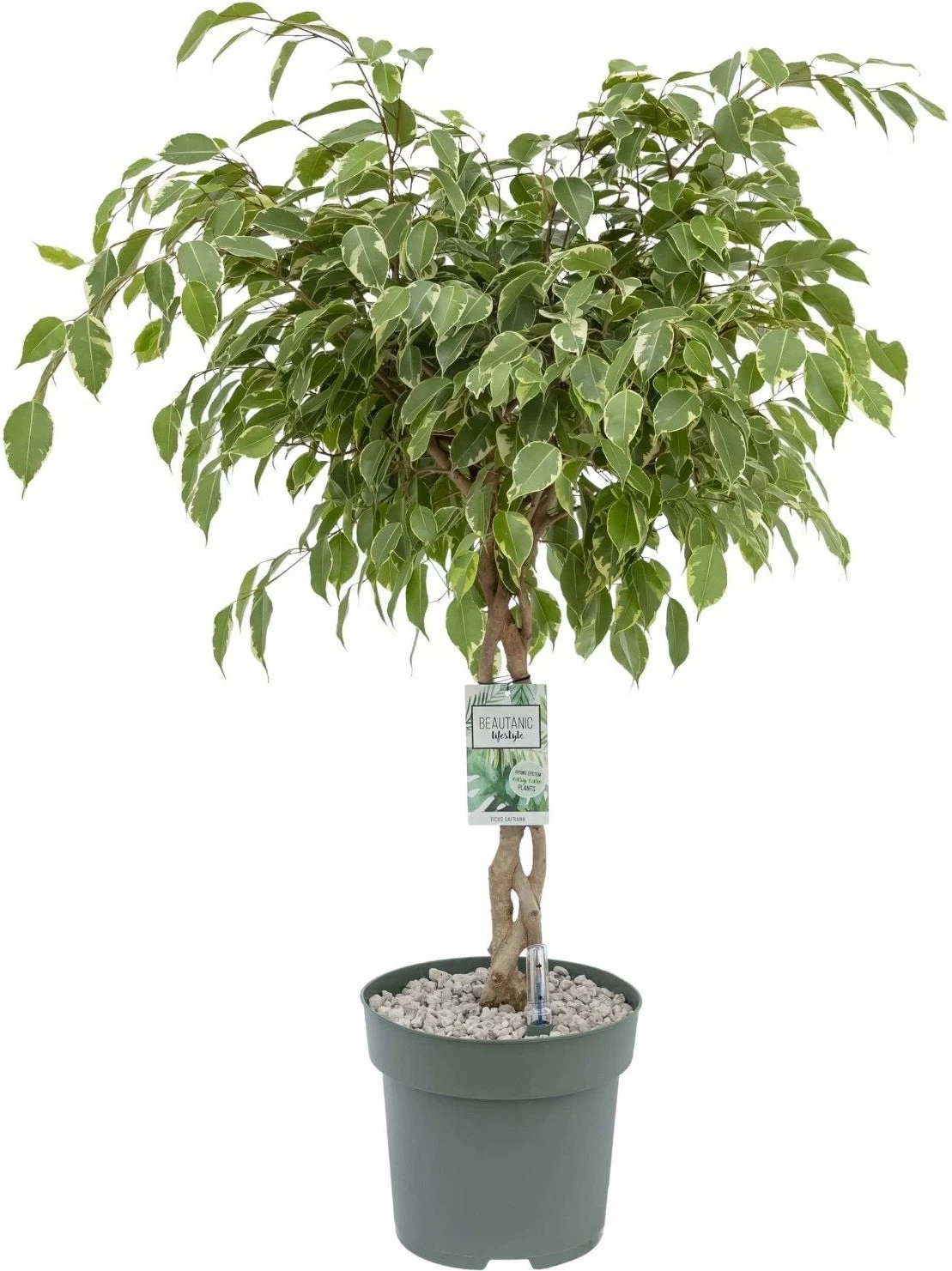 De Ficus benjamina is een van de bekendste soorten van de Ficussen voor in de huiskamer. Hij heeft kleine gladde blaadjes en wat hangende takken. Dit soort heeft geelgroene/bonte bladeren.