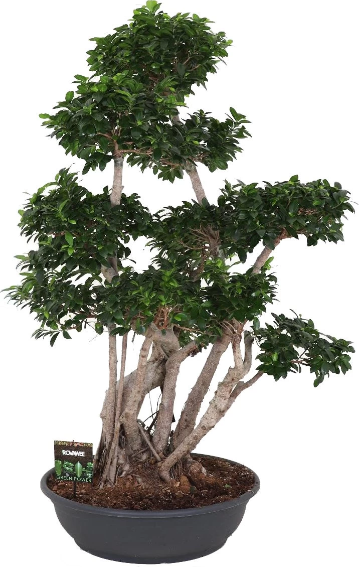 De Ficus microcarpa is een Oosterse schoonheid. Hij groeit in het zuiden van China en Maleisië. Het bijzondere van deze plant zijn de luchtwortels die hij vormt, deze hangen naar beneden en als ze de grond raken verhouten ze. Dit geeft de Ficus microcarpa zijn bijzondere uiterlijk. Elke plant heeft een unieke eigen vorm. Het blad is druppelvormig en is helder groen en voelt wat leerachtig aan.
