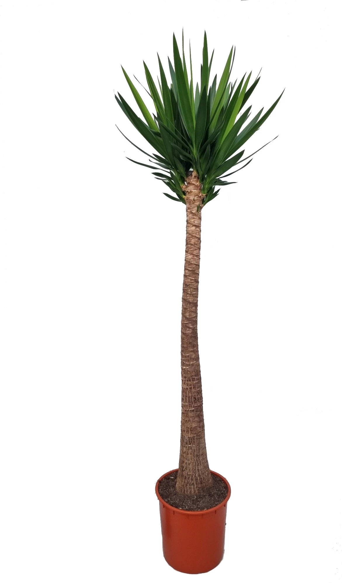 Ze hebben lange smalle bladeren en zijn te vinden met stam of zonder stam. In de natuur bloeien ze in prachtige trossen witte bloemen, in de huiskamer doen ze dit vaak niet. Bij ons is hij een prachtige stoere bladplant voor binnen die tegen een stootje kan. Een Yucca vormt blad aan de bovenkant van de stam. Hij heeft graag een lichte standplaats en vraagt niet veel water. De Yucca elephantipes kan in de natuur een boom worden van 10 meter hoog. Hij kan bloeien, maar zal dit meestal pas doen als hij wordt ‘verwaarloosd’. Uit nood zal hij dan gaan bloeien om te zorgen voor ‘nakomelingen’.
